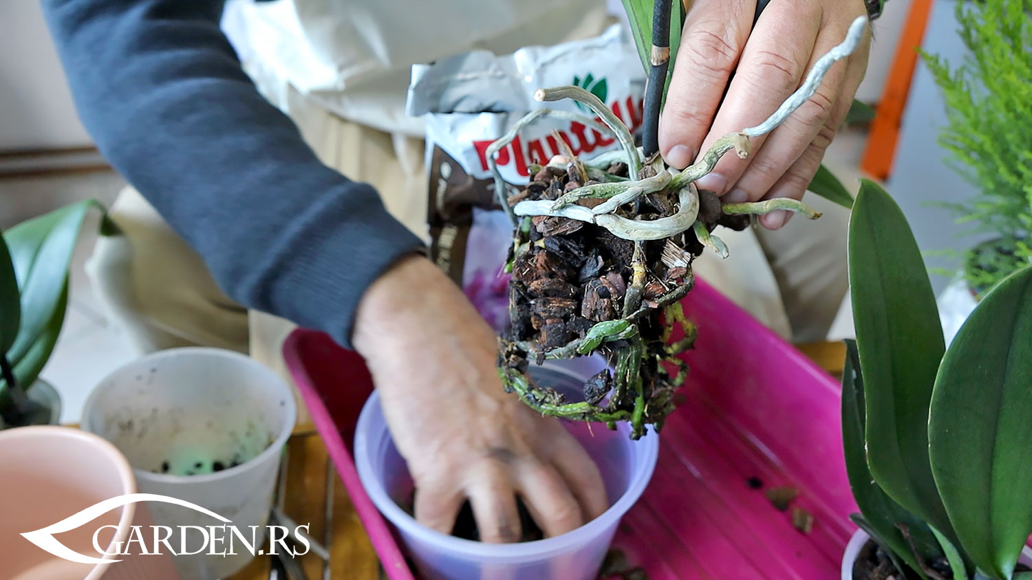 - Izvadite biljku: Polako izvucite orhideju iz stare saksije, držeći je pri dnu stabla, a ne za listove ili cvetne drške.