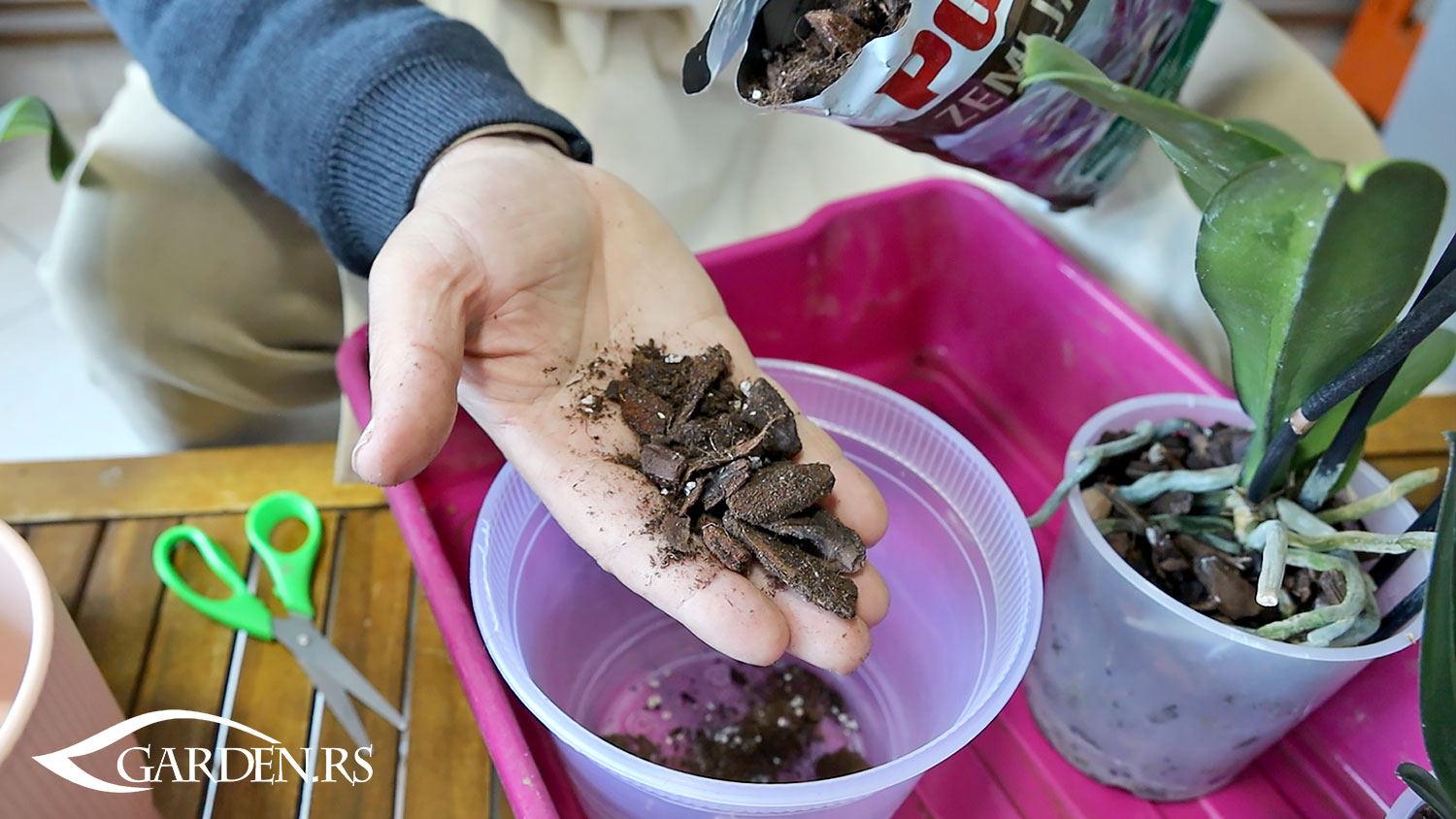 Orhideja se mora saditi u prozirne saksije sa dovoljno rupa za drenažu. Prozirnost je ključna jer korenovi orhideje takođe vrše fotosintezu. Saksija treba da bude samo malo veća od prethodne (za jedan broj ili dva). Prevelika saksija će usmeriti energiju biljke na razvoj korena umesto na cvetanje.Supstrat je možda najvažniji faktor. On ne sme biti obična zemlja za cveće! Orhidejama je potreban specijalni, prozračni supstrat sastavljen od krupnih komada kore, kokosovih vlakana i perlita, koji omogućava prozračnost i sprečava truljenje korena.
